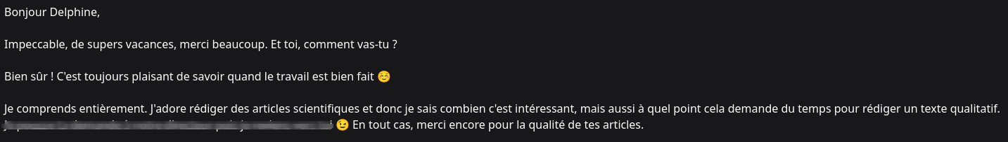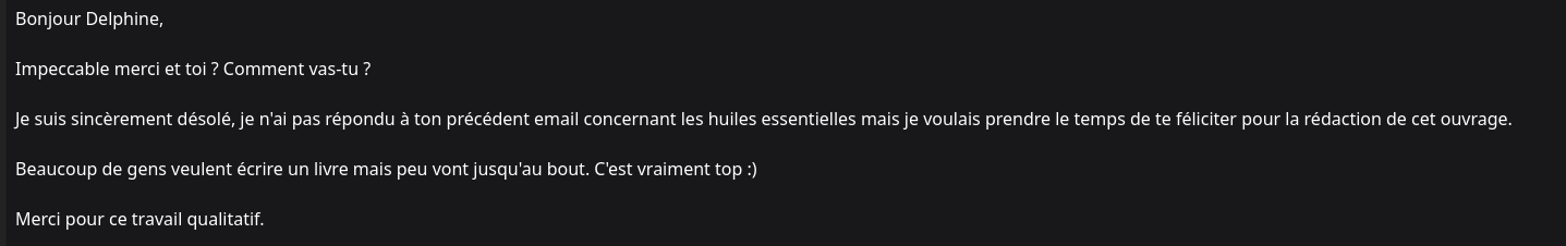 Publié sur élina gardinalTrustindex vérifie que la source originale de l'avis est Google. Travailler avec Delphine a été hyper bénéfique. Son travail a eu un bel impact sur notre stratégie de référencement. J'espère re-travailler avec Delphine sur d'autres missions !Publié sur Hélène le Masson Projet Action SanteTrustindex vérifie que la source originale de l'avis est Google. Delphine a su mettre en évidence les bienfaits des fibres dans l'alimentation en s'appuyant sur une documentation solide. Cet article a interessé et interpellé mes patients. merci encore pour ton article.Publié sur Natacha - FiliaplumeTrustindex vérifie que la source originale de l'avis est Google. Delphine a rédigé des articles sur la psychologie pour mon blog Lune Démasquée. Elle a intégré elle-même ses textes sur WordPress. Elle a trouvé et optimisé les images. Je n'ai eu qu'à valider la publication. J'ai apprécié la qualité de son travail : une plume agréable, une bonne écoute et une capacité à répondre précisément aux attentes du client.Publié sur EpideTrustindex vérifie que la source originale de l'avis est Google. Nous recommandons vivement les services de Delphine Limousin, c’est une excellente rédactrice web. Elle est très professionnelle et de très bon conseil.Publié sur Vyse InglebardTrustindex vérifie que la source originale de l'avis est Google. J'ai eu la chance de collaborer avec Delphine Limousin pour la rédaction d’articles de blog et je suis très satisfait de son travail. Elle a su répondre à mes attentes et les articles qu’elle a rédigés étaient d’excellente qualité. Je recommande sans hésitation Delphine Limousin pour tous vos besoins de rédaction web. Elle est un atout précieux pour toute entreprise ou projet nécessitant un contenu de qualité. Un grand merci pour votre excellent travail et votre professionnalisme !Publié sur Franc PersTrustindex vérifie que la source originale de l'avis est Google. Travail très intéressant, avec le soucis de la précision, j'ai eu plaisir à consulter cet ouvrage sur l'aromathérapie. J'ai appris beaucoup de choses, me permettant de limiter mes médicaments. Je recommande !Publié sur Eva THIMONNIERTrustindex vérifie que la source originale de l'avis est Google. J'ai eu la chance de travailler avec Delphine il y a plus d'un an sur un article optimisé bénévole sur mon blog. Elle a su tenir compte de mes attentes et a été d'un professionnalisme hors pair. Je recommande donc sa plume pour vos futurs projets de rédaction web.